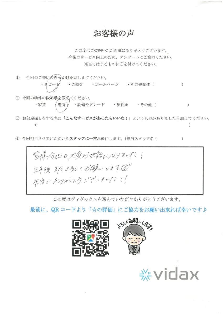 弊社で2回目のお部屋探しでしたが、無事お部屋が見つかり良かったです!