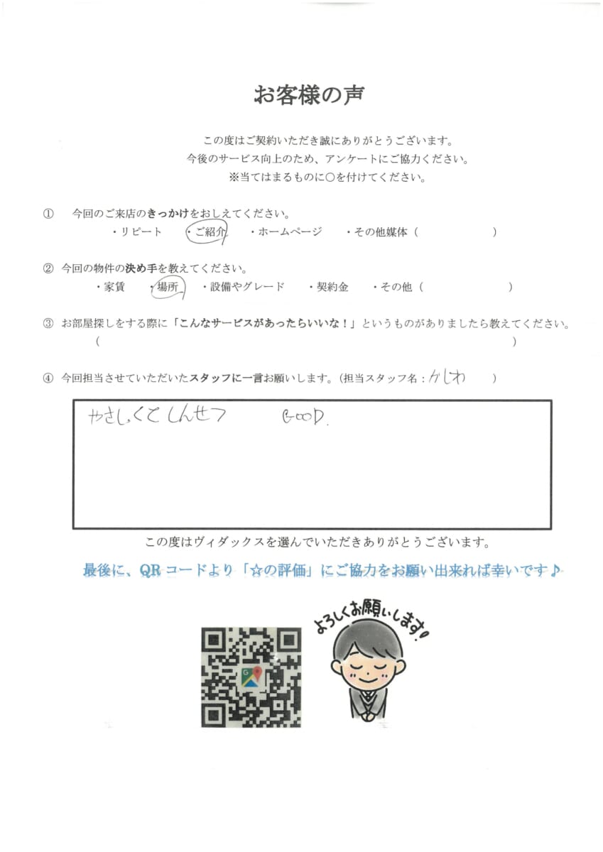 S・C様 2025 11/19 お客様の声 2025年11月19日 S・C様 やさしくてしんせつ GOOD. 担当者:渋谷店 柏 侑衣 ご契約ありがとうございました!無事に気に入ったお部屋を見つけられてよかったです!^^新生活楽しんでください! お客様の声 よかったらシェアしてね! URLをコピーしました! N・K様 S・S様 この記事を書いた人 株式会社ヴィダックス 株式会社ヴィダックスの編集メンバーが不定期で更新します。不動産界隈の最新ニュース・物件更新情報・株式会社ヴィダックスからのお知らせやお部屋探しに役立つ情報をわかりやすく紹介します! 関連記事 T・T様 2025年11月19日 U・E様 2025年11月19日 H・H様 / H・A様 2025年11月19日 アーティスト:4s4ki様 2025年11月19日 N・K様 2025年11月19日 K・Y様 2025年11月19日 T・M様 2025年11月19日 K・C様 / K・Y様 2025年11月19日