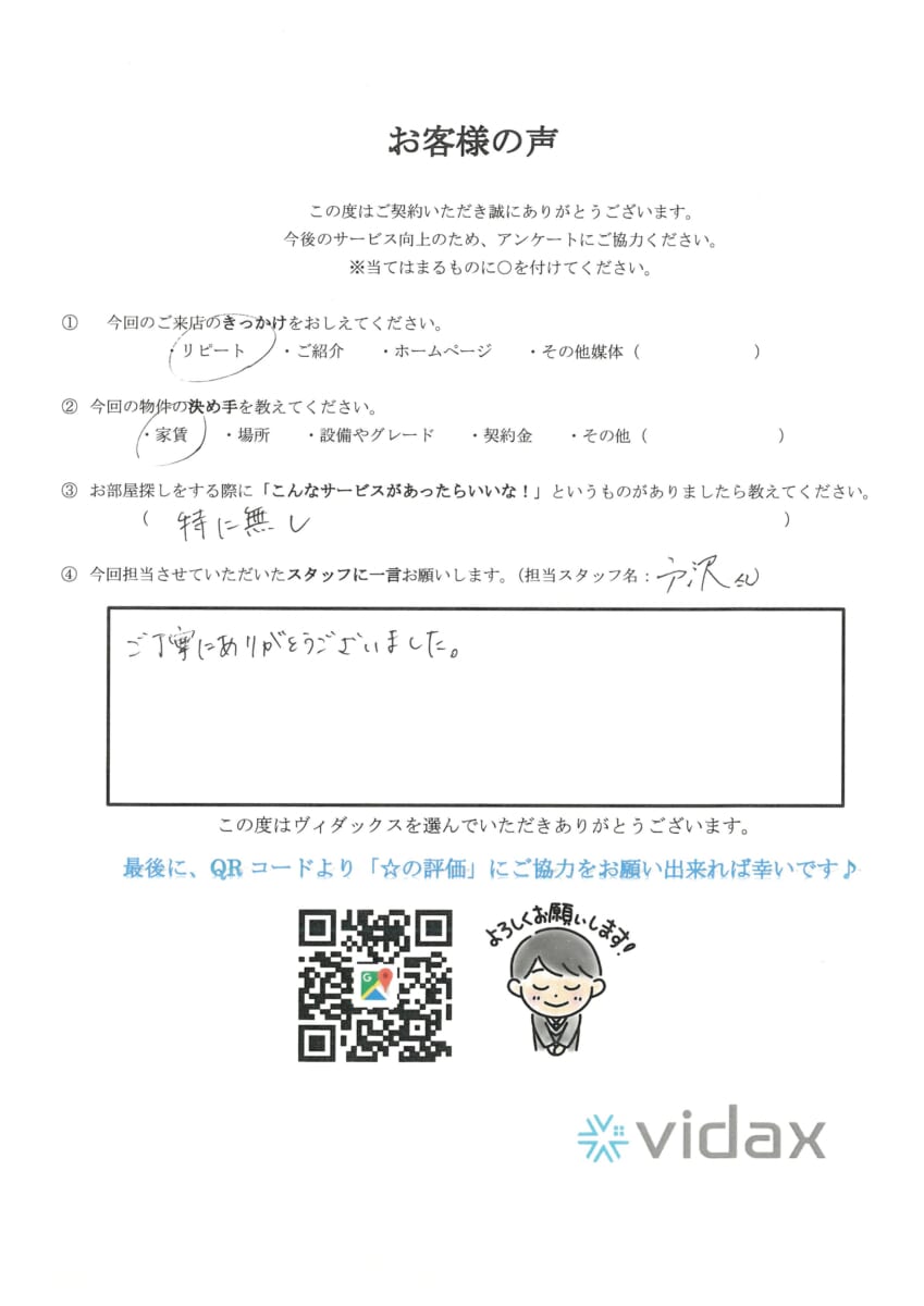 気になっていた物件が先に申し込みが入り取られてしまったというトラブルもありましたが、良い物件をご紹介出来て幸いです!