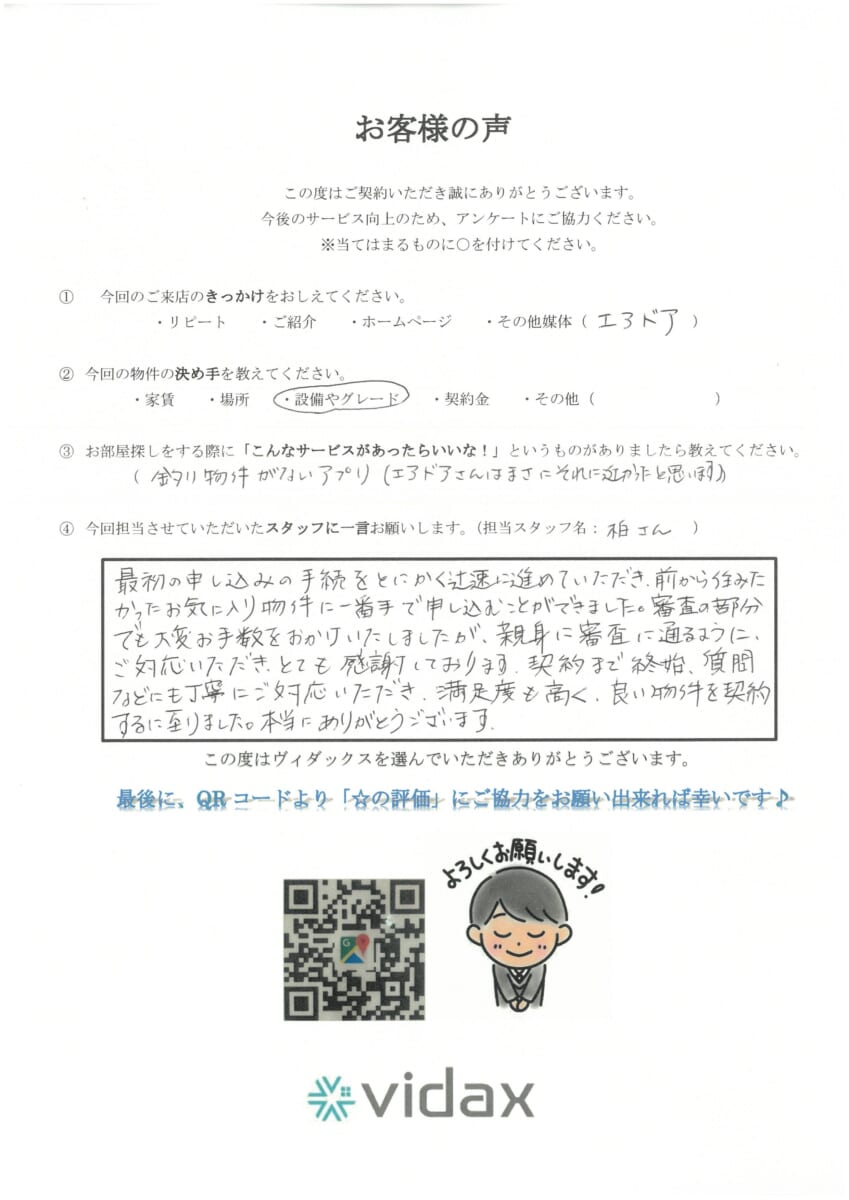 最初の申し込みの手続きをとにかく迅速に進めていただき、前から住みたかったお気に入りの物件に一番手で申し込むことができました。