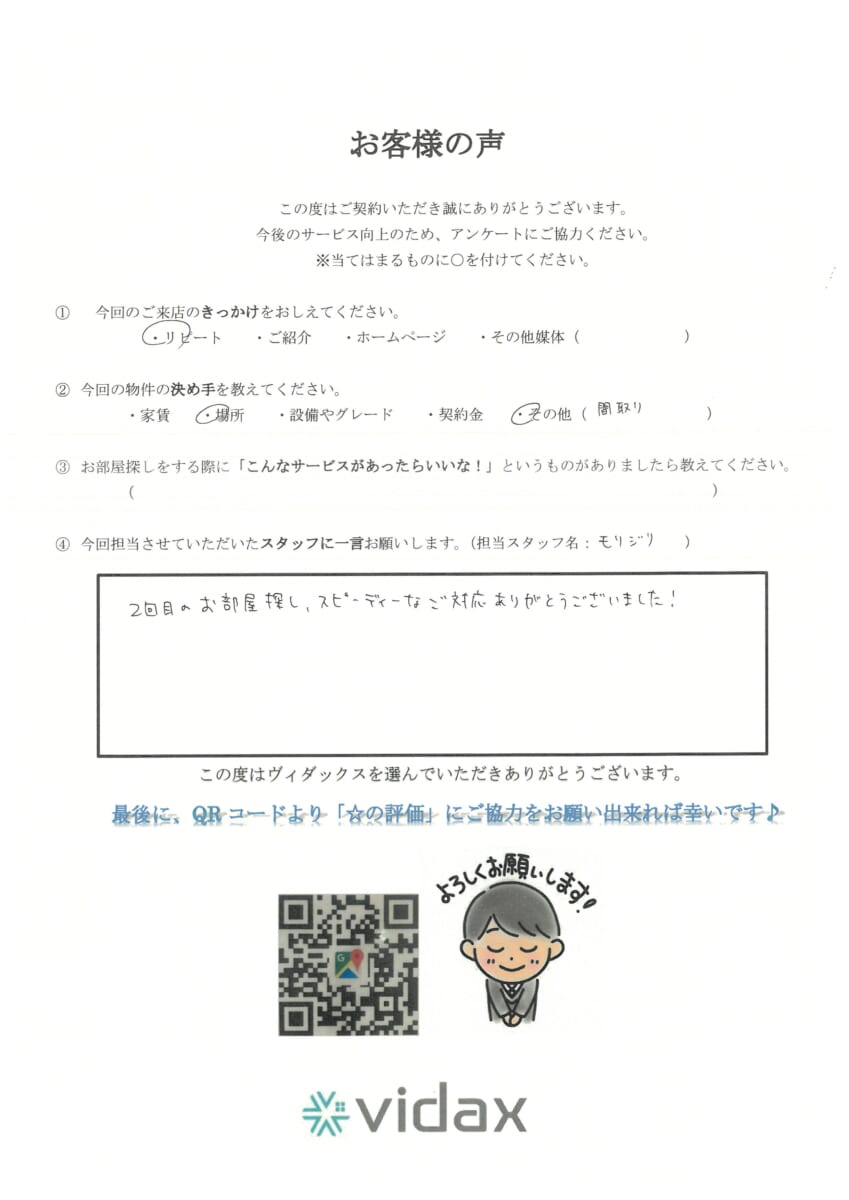 2回目のお部屋探し、スピーディーなご対応ありがとうございました!