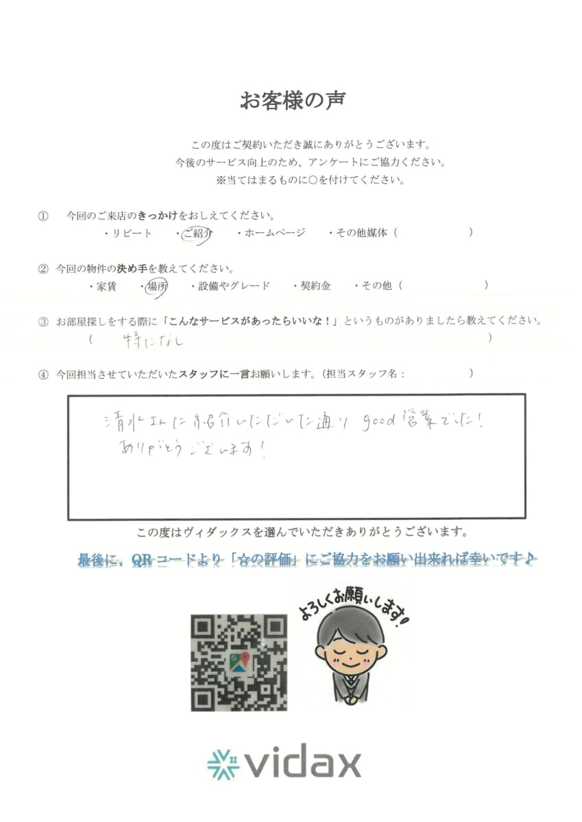 清水さんから紹介いただいた手前、失敗出来なかったので良いお部屋紹介出来て良かったです。笑