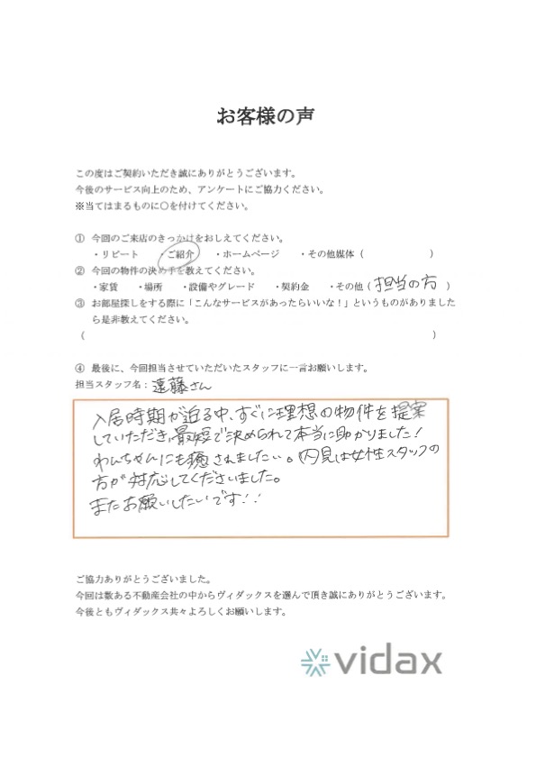 入居時期が迫る中、すぐに理想の物件を提案していただき、最短で決められて本当に助かりました!