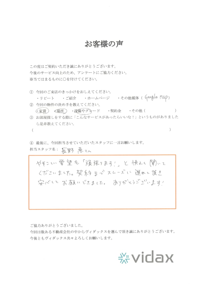 ややこしい要望も「頑張ります!」と快く聞いてくださいました。契約までスムーズに進めて頂き、安心してお願い出来ました。ありがとうございます!